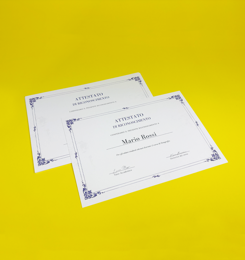 I diplomi e gli attestati sono il modo classico per celebrare traguardi, riconoscere i risultati e conferire premi formali. Che si tratti di successi accademici, formazione aziendale, certificati per dipendenti o eventi speciali, sono un ricordo tangibile dell'impegno e della dedizione di una persona.
