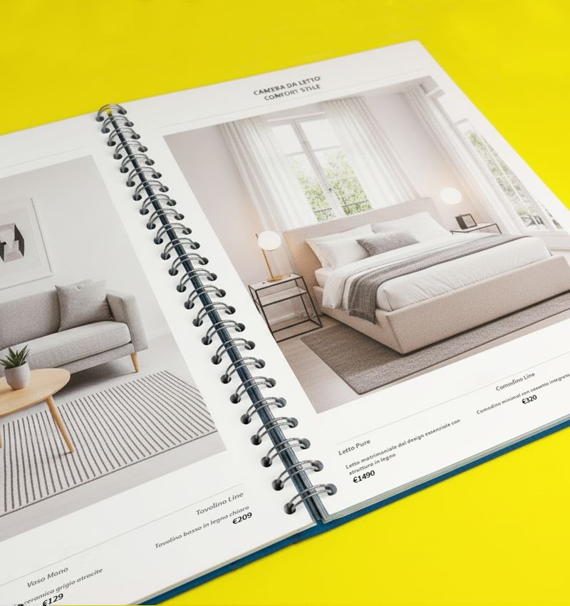 Realizzati su misura e pensati per ogni esigenza, possono essere confezionati con rilegatura a filo Singer e copertina morbida. Una soluzione elegante, funzionale grazie al filo disponibile in più colori e che unisce resistenza, praticità e un’estetica moderna. Ideali per fiere, presentazioni, reti vendita o qualsiasi attività di distribuzione. Affidati a noi per realizzare listini, manuali e cataloghi che parlano davvero del tuo business: chiari nei contenuti, solidi nella struttura, efficaci nel risultato.