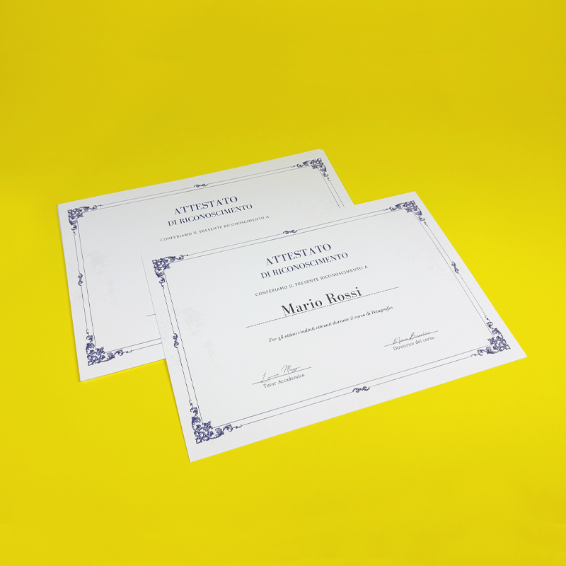 I diplomi e gli attestati sono il modo classico per celebrare traguardi, riconoscere i risultati e conferire premi formali. Che si tratti di successi accademici, formazione aziendale, certificati per dipendenti o eventi speciali, sono un ricordo tangibile dell'impegno e della dedizione di una persona.